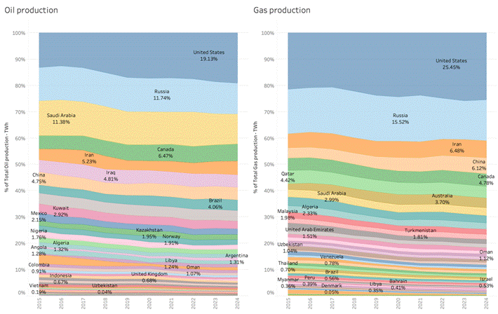 Figure 1: Global oil (left) and gas (production) by country (2015-2024)