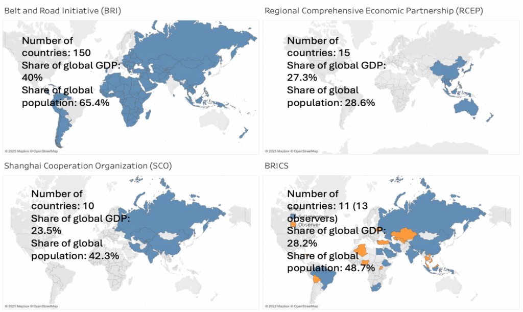 China’s regional engagement in 2025 centred on reinforcing multilateral political frameworks and promoting its governance concepts in the Asia-Pacific and the Global South based on several frameworks in which it has a leading position (see Figure 1).