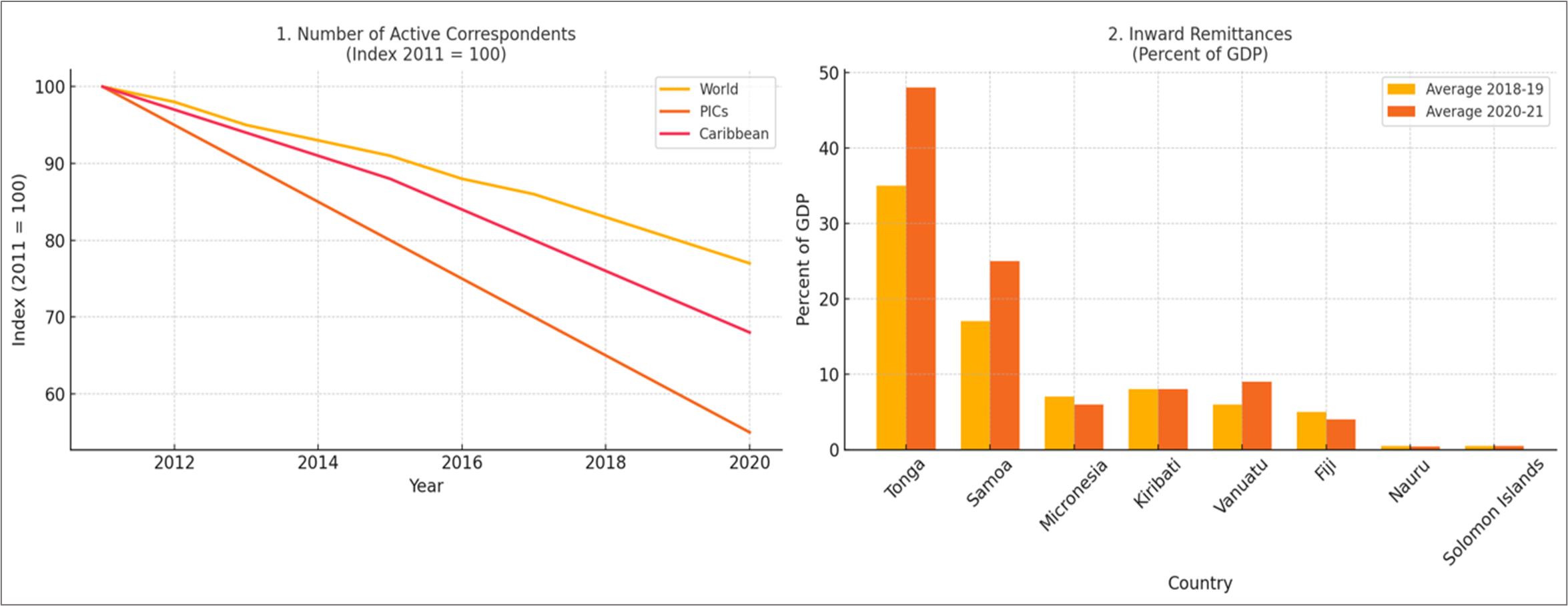 Figure 3. Pacific Island Countries: Inward Remittances and Number of Active Correspondent Banking Relationships
